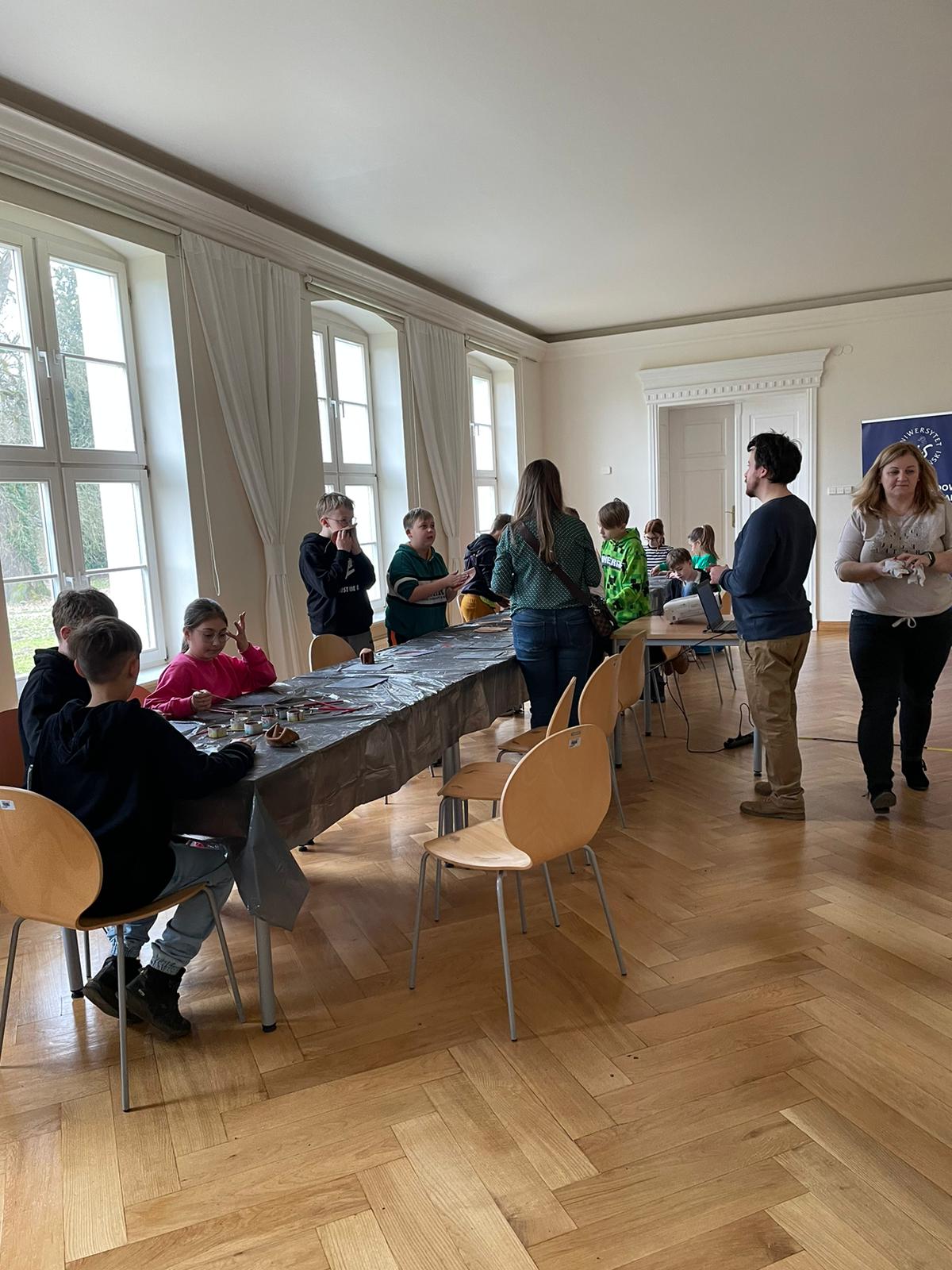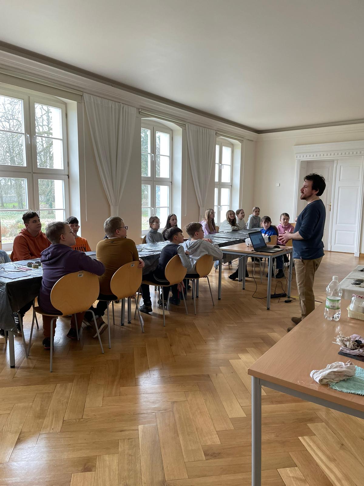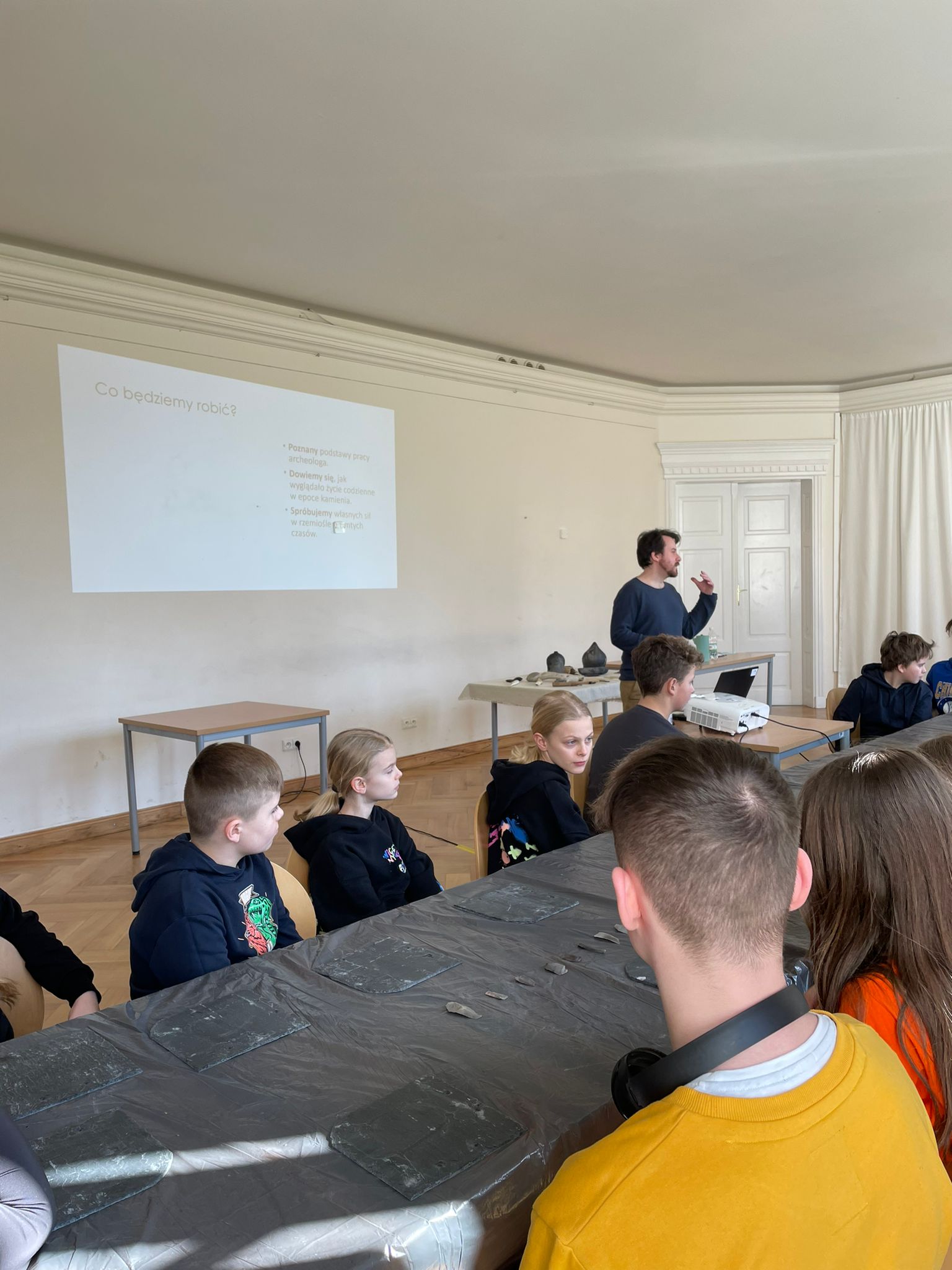 były adresowane do starszych uczniów szkół podstawowych i liceów. Podczas 90-minutowych spotkań uczestnicy mieli okazję zapoznać się z podstawami pracy archeologa oraz dowiedzieć się jak wyglądało życie w epoce kamienia. Szczególną atrakcję stanowiła część praktyczna. Mając do dyspozycji materiały takie jak np. farby na bazie ochry i kredy, skóra czy płytki z łupku i krzemienne rylce, w twórczy, angażujący sposób uczestnicy mogli zademonstrować swoje umiejętności plastyczne oraz pokazać, czego dowiedzieli się podczas prelekcji. Warsztaty stanowiły kontynuację spotkań zapoczątkowanych w roku 2023 w ramach stypendium na upowszechnianie kultury przyznane przez Ministra Kultury i Dziedzictwa Narodowego.